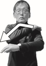 | 左手のひらに右手親指を乗せ、伸ばした右手人さし指を右に半回転させる |