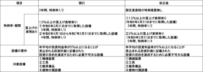【固定資産税の特例の改正について】 「令和7年度税制改正の大綱」(令和6年12月27日閣議決定)において、中小企業の前向きな投資や賃上げを後押しするため、賃上げを行う企業を対象に、設備投資に伴う負担を軽減する固定資産税の特例措置の適用期限を令和7年度から令和8年度の2年間延長するとともに、賃上げ率に応じて軽減率を引き上げることが決定されました。 現行と改正後の相違点は以下の表をご確認ください。