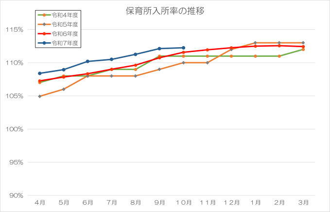令和4年度から令和7年10月までの施設利用定員に対する入所者の比率は、次のグラフのようになっています。