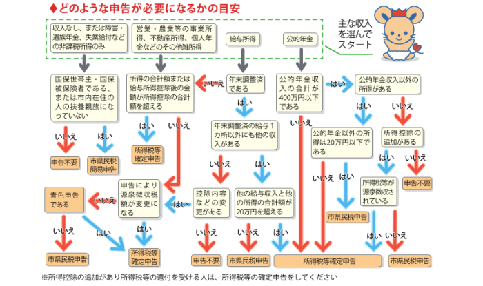 A. 公的年金等収入が400万円以下で、他の所得が20万円以下の場合は、確定申告の必要はなくなりましたが、市県民税の申告は必要です。また、控除等の追加により、所得税額が変更となる場合は、所得税等の還付が受けられます。400万円以下の公的年金以外に他の所得がない場合で、所得税額に変更がない場合でも、控除等の追加がある場合は市県民税申告をしてください。