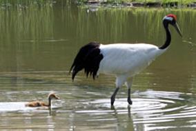 きびじつるの里で6月2日に誕生したタンチョウのヒナを野外放飼場(池)へ移しました。