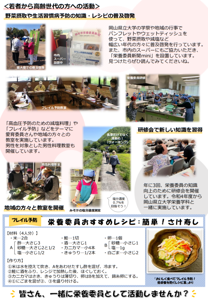 栄養委員は、乳幼児から高齢者までの食生活改善活動や運動普及活動を行っているボランティア団体です。市民の皆さん一人ひとりが充実した豊かな生活を過ごせるよう、地域に根差した活動を行っています。 興味がある方、ぜひ一緒に活動してみませんか。
