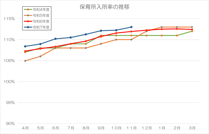 令和4年度から令和7年11月までの施設利用定員に対する入所者の比率は、次のグラフのようになっています。