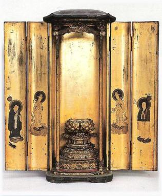 内面に金箔(きんぱく)が張られ、扉の左右には正規の仏絵師によると思われる観音菩薩(ぼさつ)・法然上人、勢至菩薩・善導大師の絵が描かれています。中央には蓮華(れんげ)の台座が据えられ、その上に阿弥陀如来(あみだにょらい)の立像が安置されていますが、阿弥陀如来像は後世のものと考えられています。小型ながら、装飾性に富んだ貴重な工芸品です。