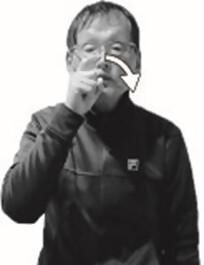 | 曲げた右手人さし指を鼻に当て、左下へ下ろす。曲げた左腕の上で、右手で「山」の手話をする | |