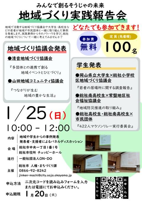 地域で活動する地域づくり協議会や大学生・高校生などの若者が地域や市民団体と一緒に取り組んだ事例を発表します。実践事例からそのノウハウを学び,総社の地域づくりについて一緒に考えてみませんか?