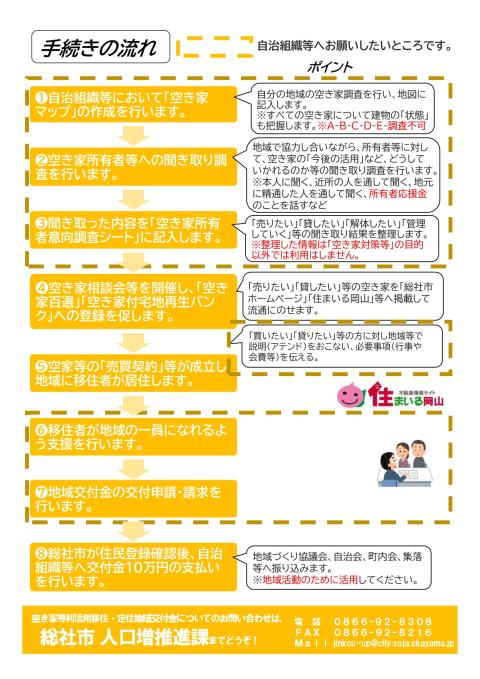 総社市では,移住等希望者を円滑に受け入れるための活動を行い,移住等希望者が移住・定住した場合に,自治組織等に対し,「空き家利活用移住・定住地域交付金」を交付することで,空き家および空き家跡地の利活用による移住定住の促進を図ることに取り組んでいます。※自治組織等とは,市内の地域づくり協議会,自治会,区,町内会及び集落等の組織を言います。