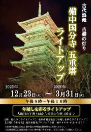 吉備路のシンボルである備中国分寺五重塔をライトアップし、観光客をはじめとした多くの人に、五重塔の良さを再認識し、親しんでもらおうと実施します。