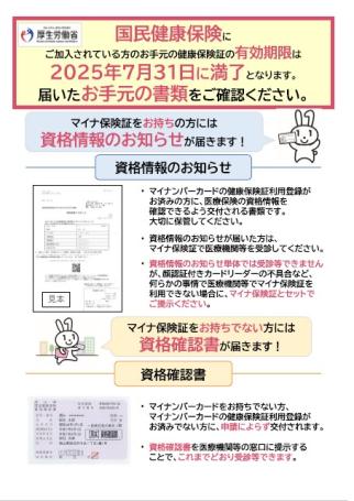 現在交付中の保険証は、記載されている有効期限(最長で令和7年7月31日)まで有効なものですので、マイナ保険証を使って医療機関を受診することが難しい場合は、有効期限内の保険証を使用して受診してください。