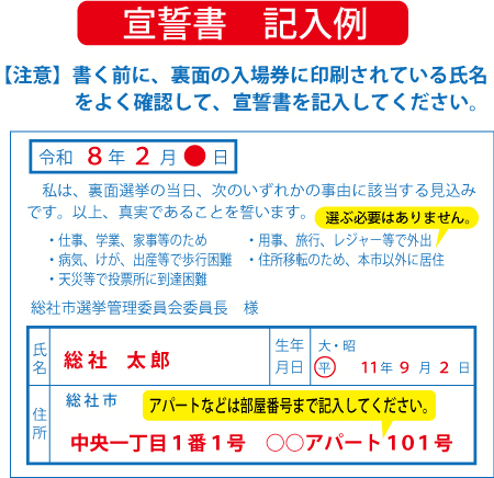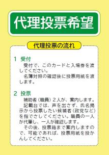 代理投票とは、選挙人がケガや病気、その他の事由により、自ら投票用紙に候補者の氏名等を記載することができない場合に、その選挙人に代わって投票者(係員)が代筆する制度です。代理投票をされる場合は、投票所、または期日前投票所の係員にお申し出ください。