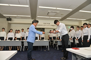 市役所や市消防本部で就業体験をするインターンシップ生として、岡山県立大学から10人、くらしき作陽・作陽短期大学から5人、川崎医療福祉大学から2人、中国学園・中国短期大学から3人、環太平洋大学から12人、京都産業大学から1人、倉敷芸術科学大学から1人、岡山商科大学から9人、ノートルダム清心女子大学から7人、計50人を受け入れるに当たり、市庁舎で開講式が行われました。 市長は、「インターンシップでは普段の学校生活で経験できないことが多いと思います。市の行政運営の現場を肌で感じ、自分の目で見て、耳で聞いて学んで、皆さんの将来に役立ててください」と学生を激励し、辞令を交付しました。 インターンシップ生は、総合政策部や産業部、消防本部など10部署で公務員の業務を体験します。