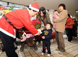 「毎月第3日曜日は?」、「そうじゃ家族の日」を合言葉に、ポインセチアの鉢植えが、市民にクリスマスプレゼントされました。 プレゼントされたのは、市内の園芸業者から21日に寄贈された80鉢。配布場所の市役所玄関には、開始時間前から幼児といっしょの親子連れらによる長い列ができ、市長が「メリークリスマス」と声を掛け手渡しました。 21日からこの日まで、チュッピーのイラストなどとともにポインセチアは玄関をクリスマスムードにしていました。