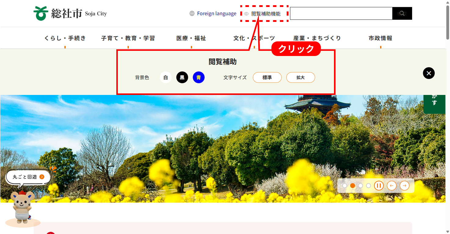 共通ヘッダーの上図の部分にある閲覧者補助機能をクリックし、「背景色」の横に並んでいる「白」「黒」「青」の各ボタンをクリックします。クリックしたボタンの色にページの背景色が変更されます。
