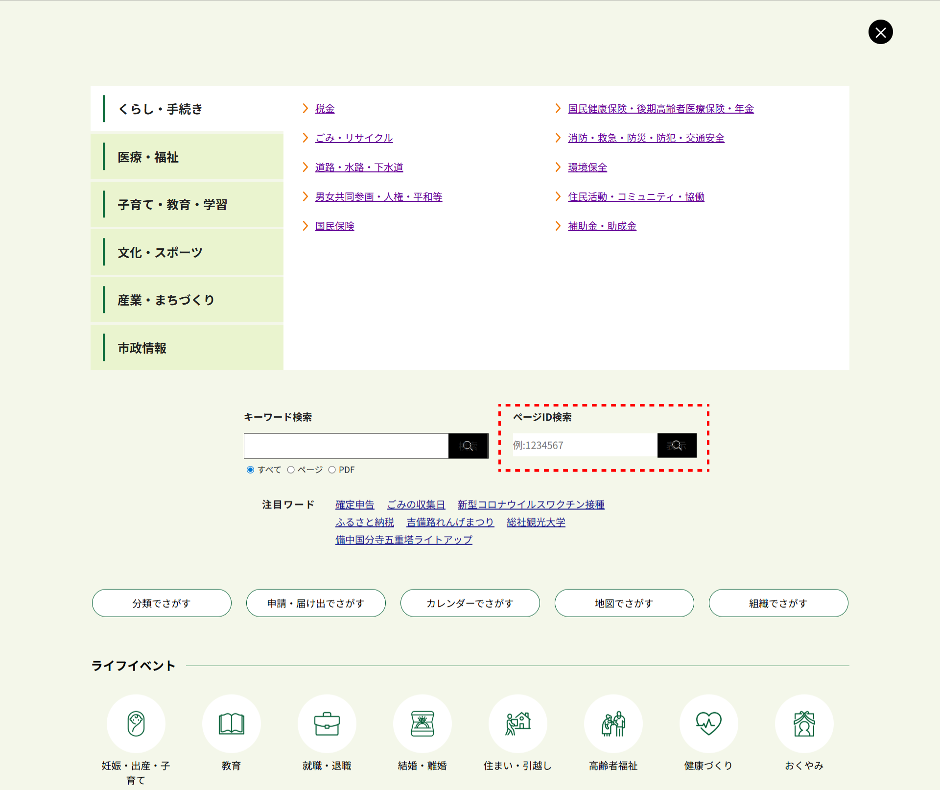 「情報をさがす」ボタンから検索したいページの記事IDを入力して、「検索」ボタンをクリックすると、該当のページに移動します。