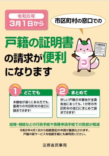 戸籍法の一部改正に伴い、令和6年3月1日から、本籍地以外の市区町村窓口でも、戸籍全部事項証明書等の請求ができるようになりました。