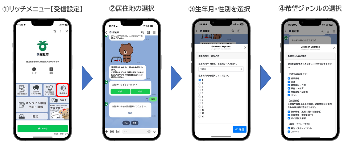 総社市公式LINEで受信設定サービスを開始しました。受信設定をしていただくことで、欲しい情報をご自身で選択して受け取れます。簡単なアンケートに答えるだけで設定できますので、ぜひ受信設定をお願いします。