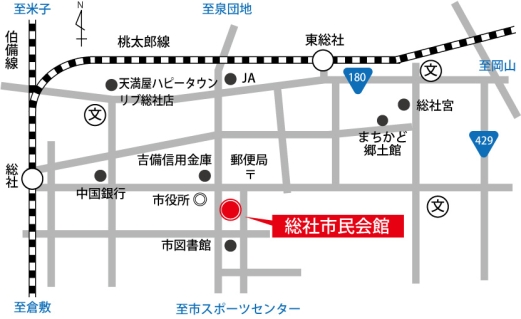- 臨時駐車場として、市役所駐車場、総社南幼稚園の南側駐車場等が使用できる場合があります。使用できるかは、必ず主催者にご確認ください。