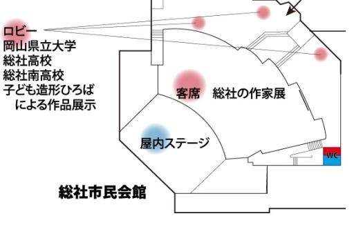 市民会館ロビーでは、市内の高校、大学の学生の皆さんと、「こども造形ひろば」に参加してくださった児童の皆さんによる作品を展示します。総社で育つ若き才能たちの作品をご覧ください。