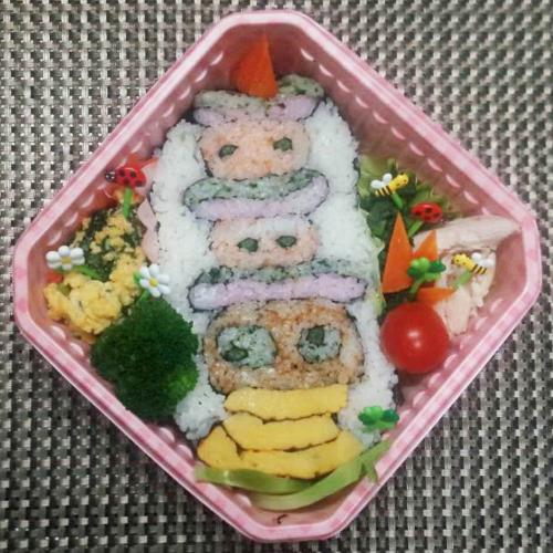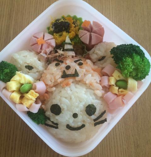 大国主命お握りは鮭フレークを混ぜ、建御名方命と櫛稲田姫は中に入れました。れんげ草には蒲鉾と枝豆、桃にはマッシュポテトと桜でんぶを使いました。ぜひ備中神楽に興味を持ってくれると嬉しいです。