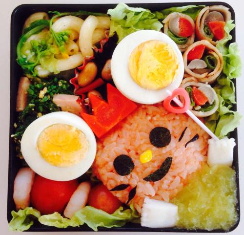 鬼の被り物をしたチュッピーが花畑にいるイメージで作りました。野菜は子供が食べやすく大好きなカボチャの黒豆入りサラダにしました。栄養バランスが良く、彩りの良いお弁当を作るように心がけています。