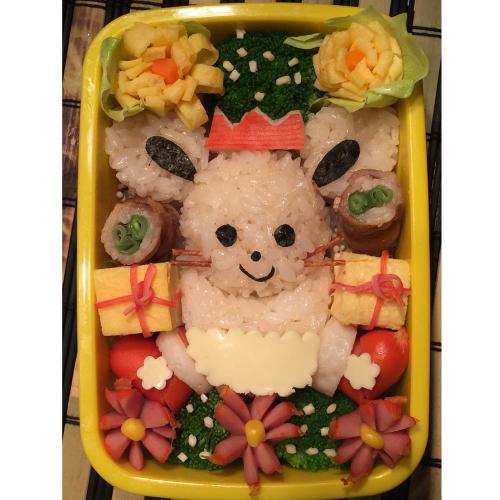 「総社のお米」を最大限にアピール!チュッピーをご飯で作り、さらに「おにぎり」を持たせました。王冠や尻尾はウインナーなどで立体的に表現してみました。
