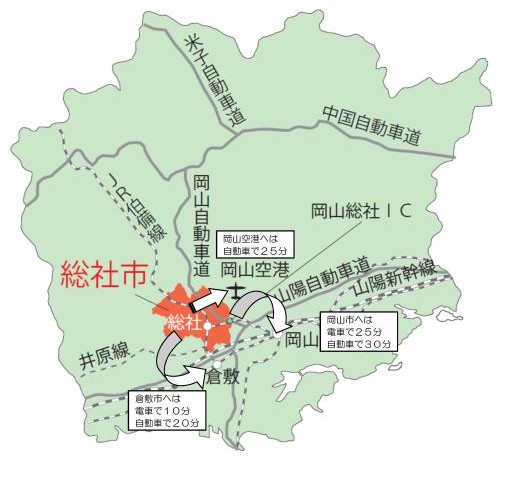 市内には岡山自動車道の岡山総社インターチェンジもあり、県内の各都市へのアクセスが簡単。また関西圏や四国、広島まで1時間から2時間でアクセスが可能です。