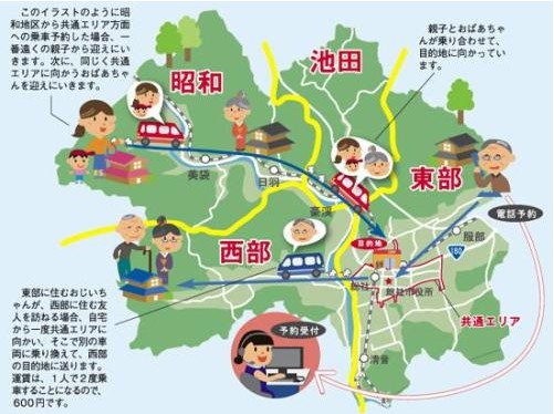 戸口から戸口を1乗車300円で結ぶ予約型乗合方式の新生活交通「雪舟くん」。従来の公共交通で生じていた交通空白地の解消と、十分でなかった公共交通網を補うために平成23年度から導入したものです。市内を距離に関係なく1乗車300円の定額で利用できることが魅力です。