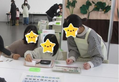 クイズラリーのポイントコーナーでは、減塩生活の啓発と「塩のひとつまみ体験」や食育SATシステムでの献立作成、正しい箸の使い方の確認、魚釣りゲームなどの体験を通じて、食に関する知識を深めていただきました。