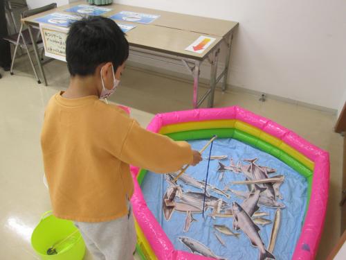 鮭や鰆、いかやえびなどいろいろな種類の魚が泳いでいる釣り堀で魚釣りをしました。釣った後は、魚の名前や特徴を確かめました。