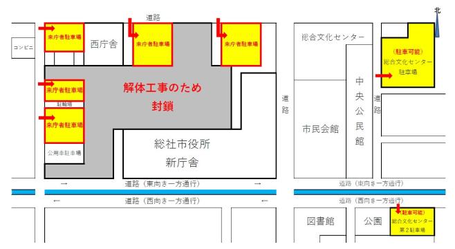 旧本庁舎、保健センター、総合福祉センターの解体工事を開始します。 なお、工事完了は令和8年9月末の予定です。工事期間中は通路などを一部封鎖しますので、市役所敷地内の通り抜けができない箇所があることから、駐車場から新庁舎入口までの距離が遠くなります。ご不便をおかけしますが、ご理解のほどよろしくお願いいたします。※市役所周辺の店舗駐車場に駐車しての来庁はご遠慮いただきますようお願いいたします。